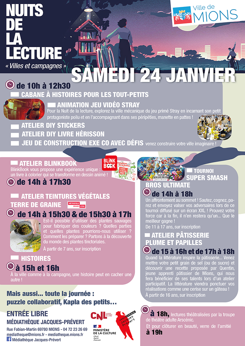 * Les Nuits de la lecture organisées par le Centre National du livre se tiennent du 21 au 25/05 2026 autour du thème « Villes et campagnes »